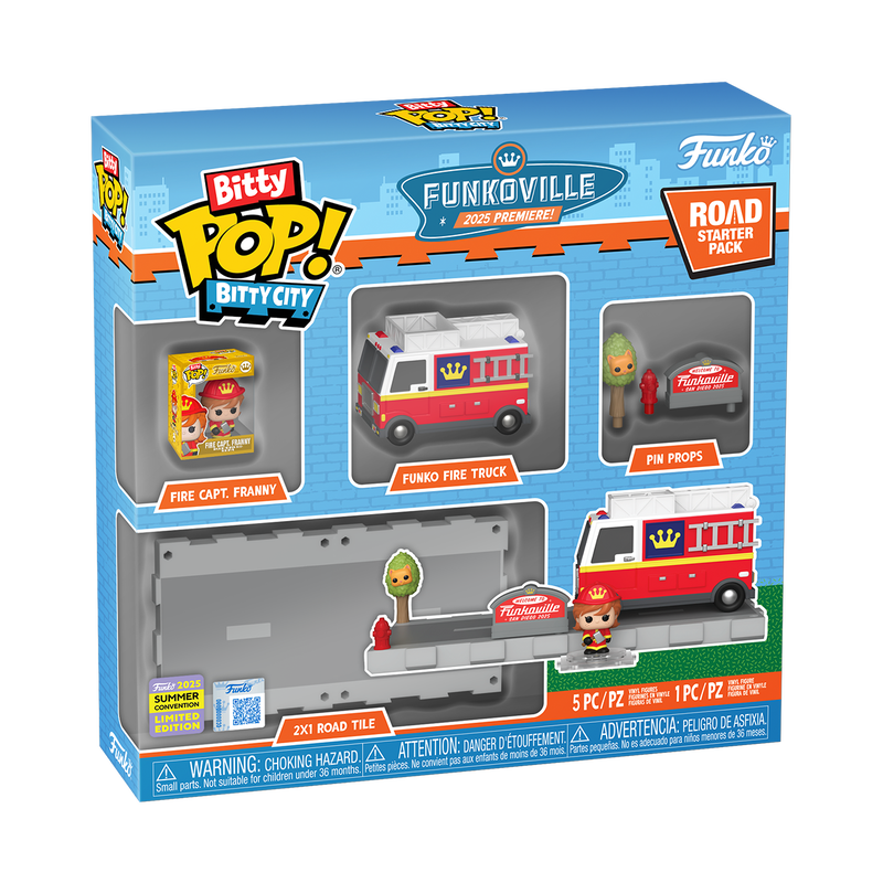 The world of POP! is getting bigger—and smaller—with Bitty POP! collectibles! Expand your Bitty City collection with the exclusive Bitty POP! Road Starter Pack! This starter pack includes 1 2×1 Road Tile, 3 Pin Props, Bitty POP! Ride Funko Fire Truck, and Bitty POP! Fire Capt. Franny. Mix and match Bitty POP! Road Pack 1 with other expansion packs and your favorite Bitty POP! collectibles to construct your own unique Bitty City! Tiles can be interlocked, elevated with Pin Risers, and accessorized with Pin Props. Vinyl 2×1 Tile is approximately 5.2 in x 2.6 in (13.2 cm x 6.6 cm). Vinyl Pin Props are approximately 0.5 in to 1.7 in (1.3 cm to 4.3 cm) tall. Vinyl figures are approximately 0.9 and 1.3 in (2.3 and 3.3 cm) tall.