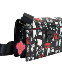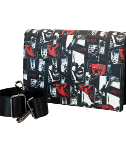 Finish it for good—your look, that is. Head to Derry in style with our IT: Chapter 2 crossbody bag. All-over eerie images of Pennywise the Clown in red, and as “photo negatives,” take center stage. In the dark, portions of the print glow! A jagged, die-cut front flap gives the look a fashionably sharp edge, and a vegan leather charm of Pennywise’s face, in red, tops off the look. Pack just what you need for the day to chase down adventures with a few good friends.