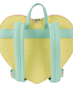This mini backpack is yellow and features a debossed pattern of hearts and stars all over it. You’ll find pastel-rainbow details along the outer edge, on the straps, and outlining the front pocket.