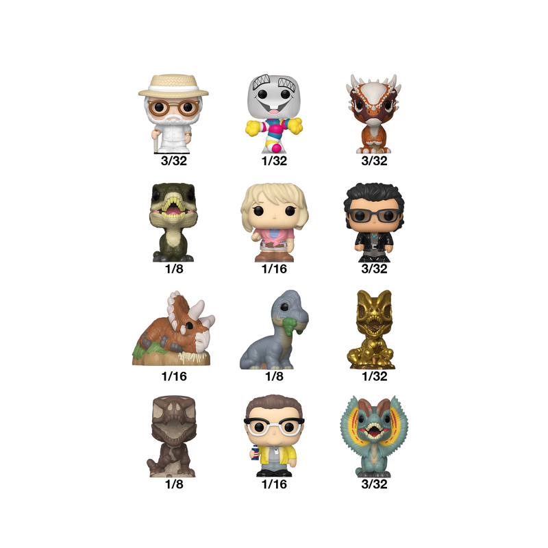 The world of POP! is getting bigger—and smaller—with Bitty POP! collectibles! Expand your Jurassic Park™ collection with this assortment of Bitty POP! figures featuring your favorite prehistoric attractions! Each Bitty POP! comes in mystery packaging and includes one collectible figure. Who will you find? There’s Bitty POP! John Hammond (3/32), Bitty POP! Mr. DNA (1/32), Bitty POP! Stygimoloch (3/32), Bitty POP! Velociraptor (1/8), Bitty POP! Ellie Sattler (1/16), Bitty POP! Ian Malcolm (3/32), Bitty POP! Triceratops (1/16), Bitty POP! Brachiosaurus (1/8), Bitty POP! Dilophosaurus Fossil – Gold (1/32), Bitty POP! Tyrannosaurus Fossil (1/8), Bitty POP! Dennis Nedry (1/16), and Bitty POP! Dilophosaurus (3/32).