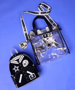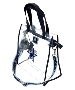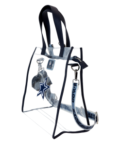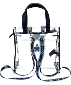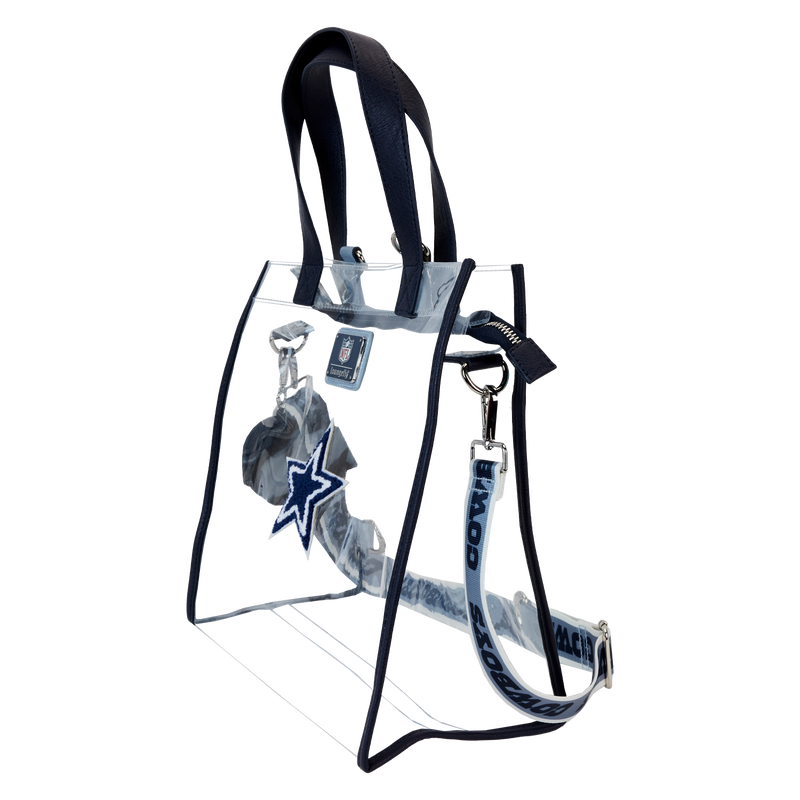Feeling game-day ready? Cheer on your favorite football team with this convertible tote bag! The clear design makes it easy to bring your belongings into the stadium, and versatile shoulder straps help to keep your bag close as you wander the crowds. A chenille patch of the Cowboys logo, a helmet-shaped bag charm, and coordinating team colors give this bag an elevated look. No need to sacrifice your style at the big game – this accessory is the perfect combination of fashion and function.