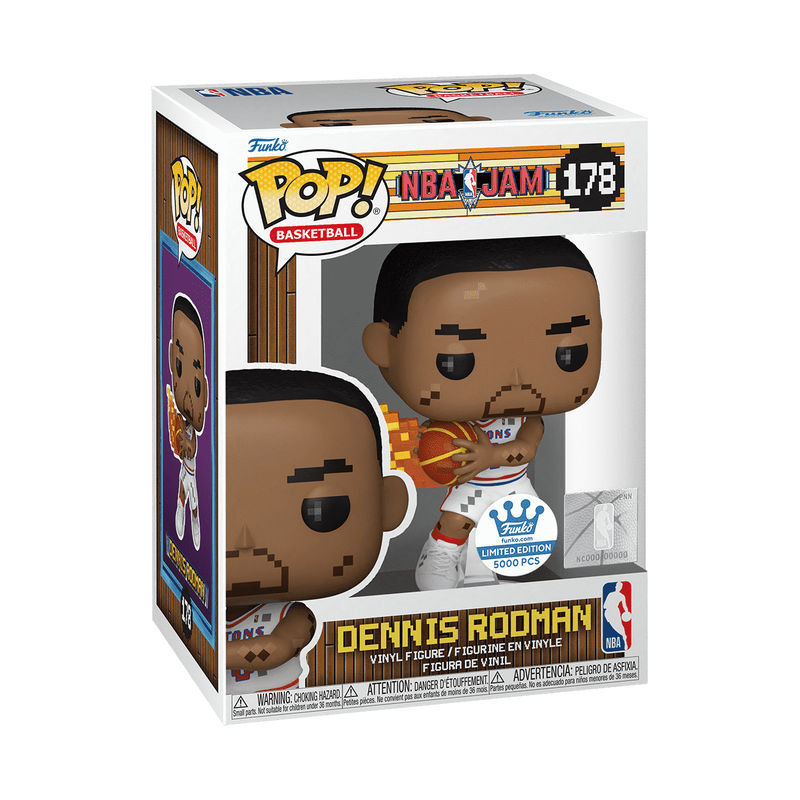 Level up your NBA Jam collection with this exclusive, pixelated Pop! Dennis Rodman! This Detroit Pistons legend is sure to be a slam dunk in your basketball set. Only 5,000 of this Limited Edition collectible were made! Vinyl figures are approximately 4 in (10.2 cm) tall.