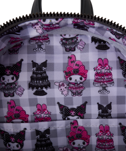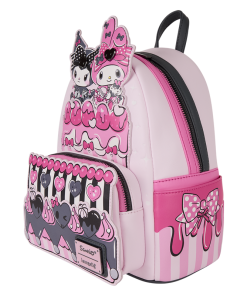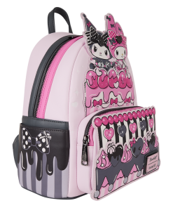 My Melody and Kuromi sit together on top of a three-tiered cake! It’s decorated with pink and black frosting to match each of their aesthetics. On one side pocket, you’ll find a pink polka dot bow and on the other pocket, you’ll find a black polka dot bow! Even the straps are two different colors – one is pink and one is black.